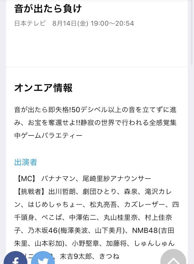08月14日(金) 19:00〜20:54 日本テレビ 「音が出たら負け」