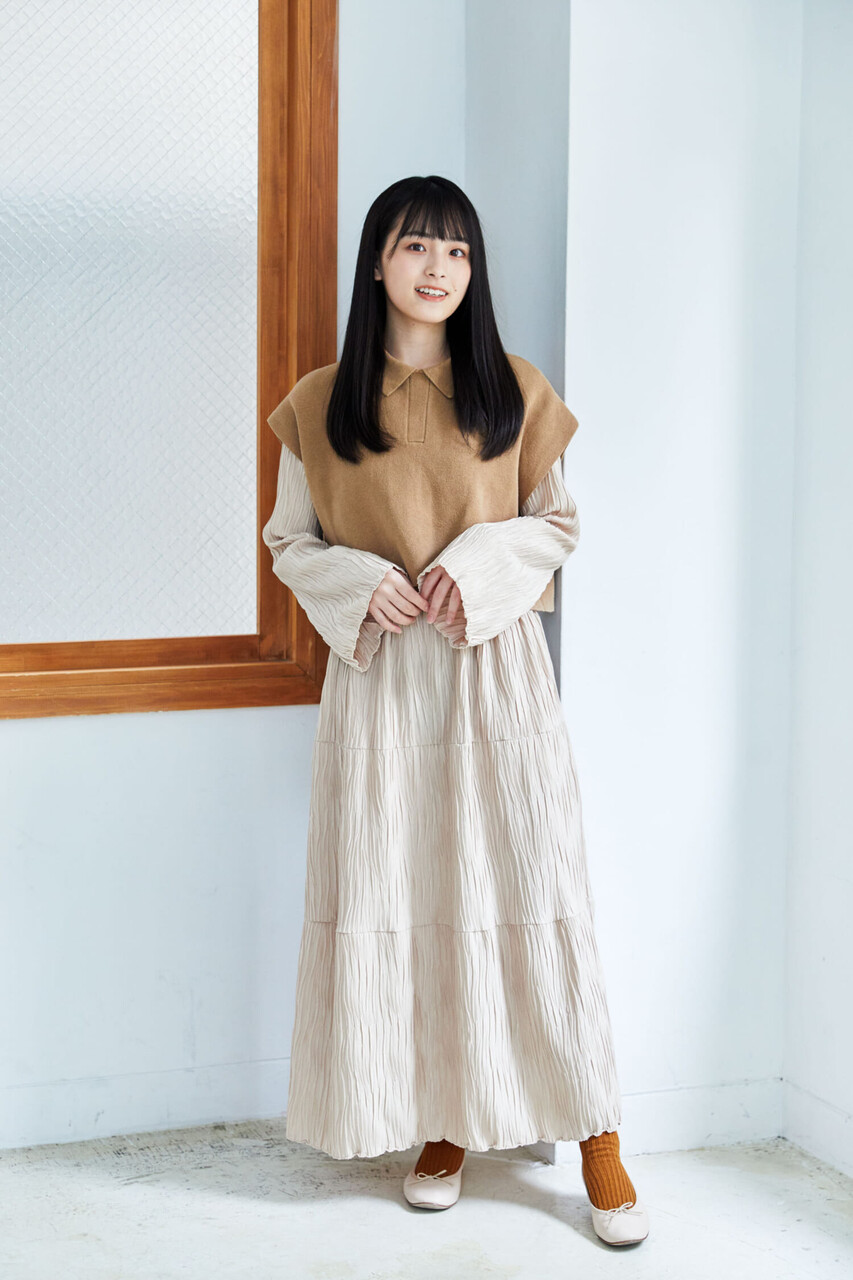 「以前は、クローゼットの中が黒一色だったけれど、最近はベージュやブラウンのようなやさしい色みに惹かれるように。肌を出すのがあまり得意じゃないから、ベージュやブラウンの可愛らしい色みを選ぶと、肌見せしなくても女性らしく見えるところも気に入ってます」。
